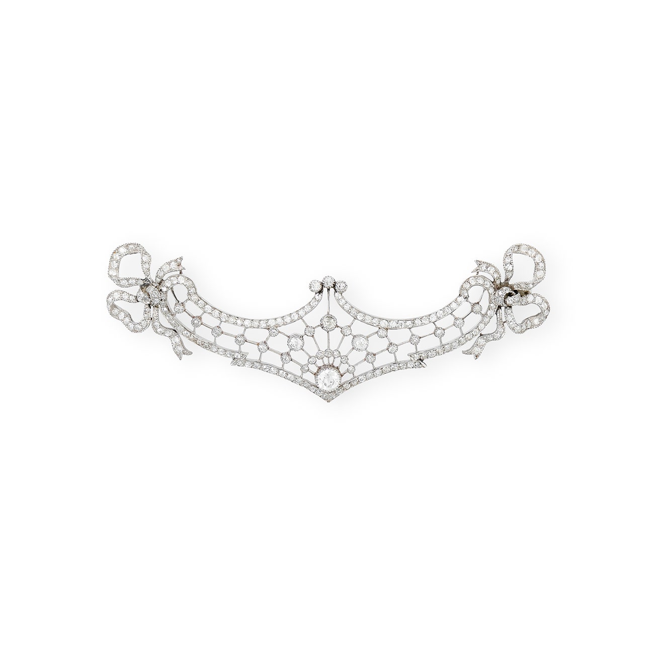 Of openwork design, the ribbon motif embellished with circular- and rose-cut diamonds,