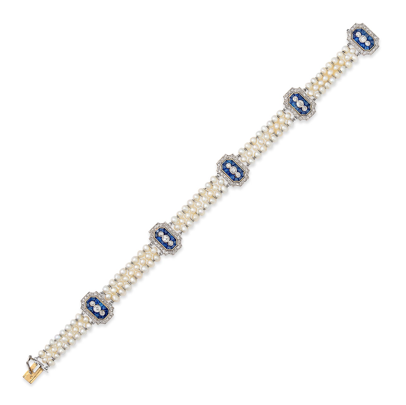 Composed of three strands of seed pearls, highlighted with calibré-cut sapphires and rose-, single- and circular-cut diamonds, length approximately 195mm, French maker's marks and assay marks for platinum and gold.