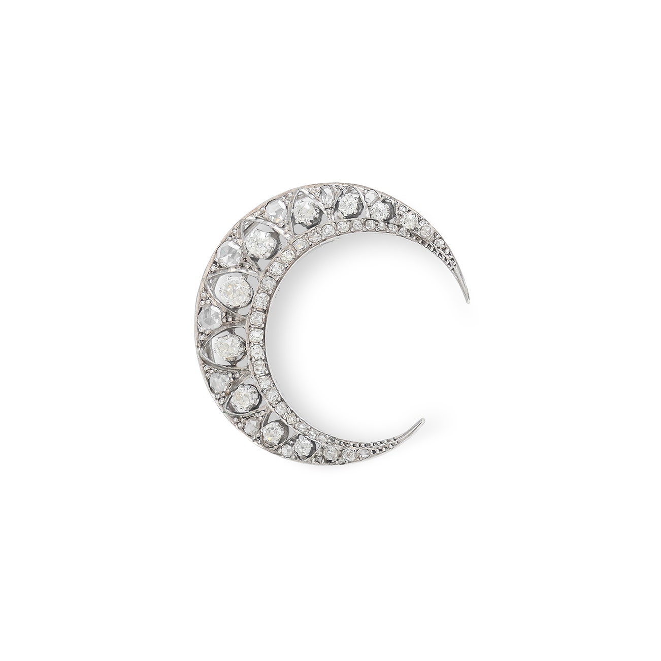 Designed as a crescent, set with circular- and rose-cut diamonds, measuring approximately 40 x 35mm.