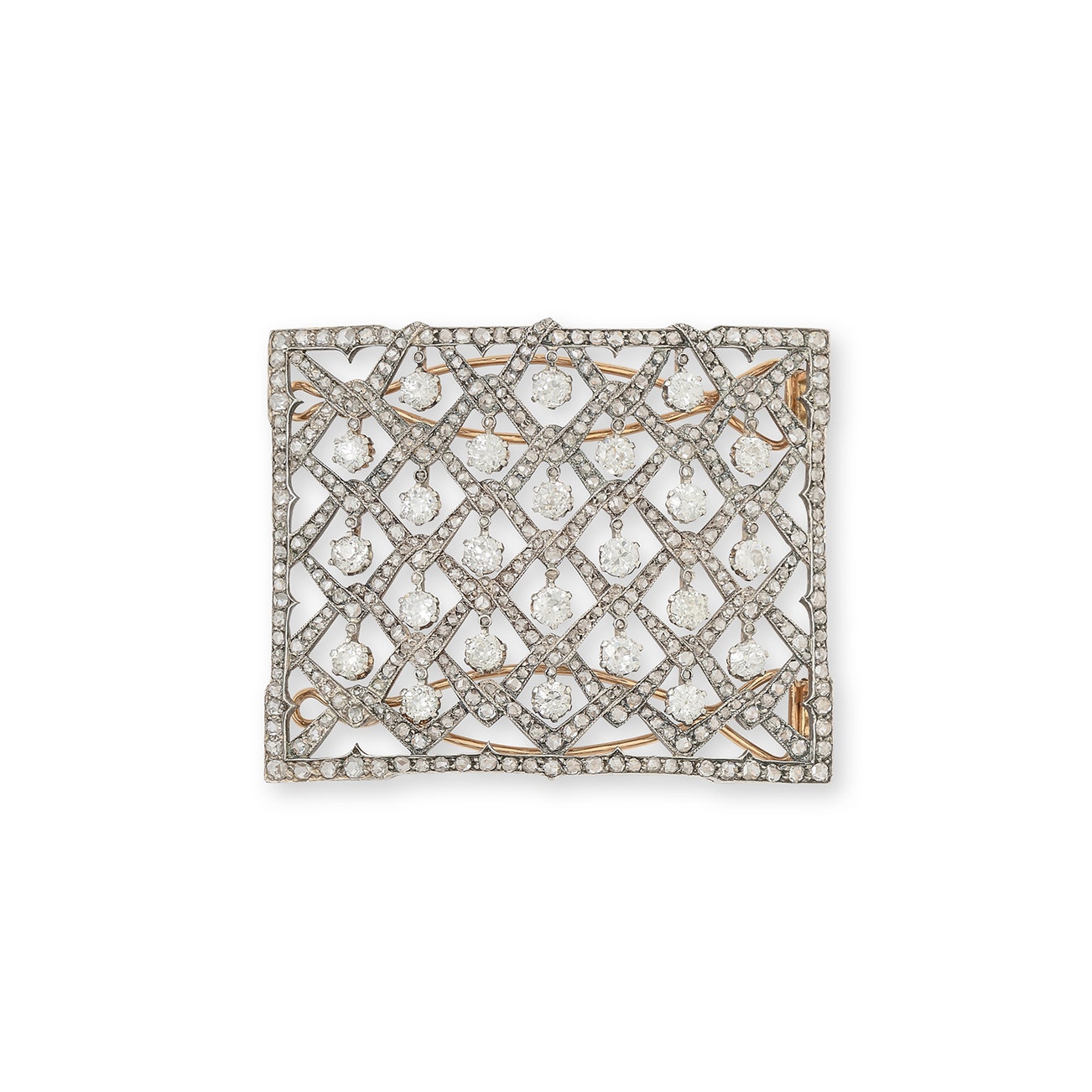 Set with circular- and rose-cut diamonds in a lattice design,
