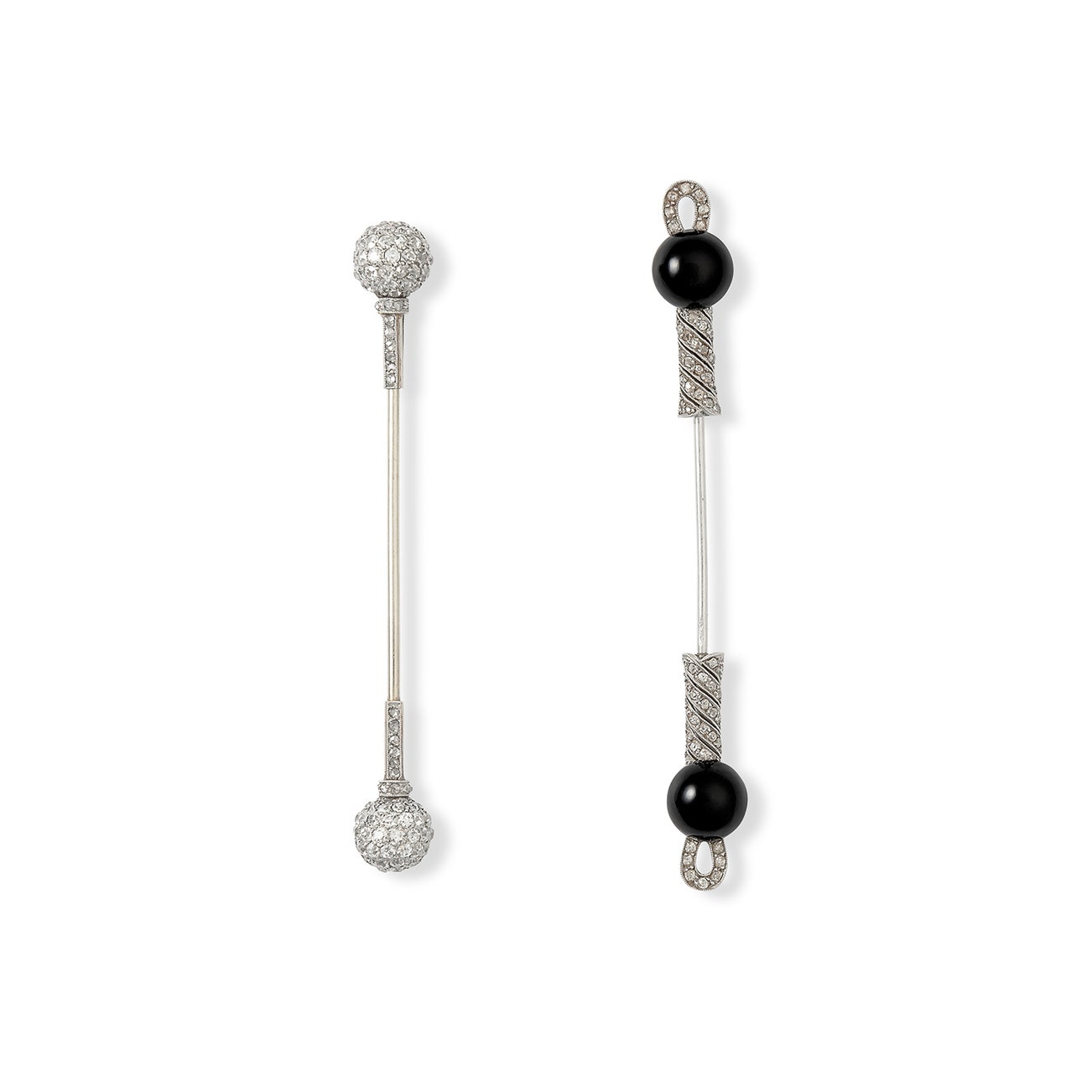 One jabot pin set with rose- and single-cut diamonds, length approximately 68mm, the second jabot pin set with polished cabochon onyxes, accented with rose- and single-cut diamonds, length approximately 77mm, French assay marks for platinum, one small diamond deficient.