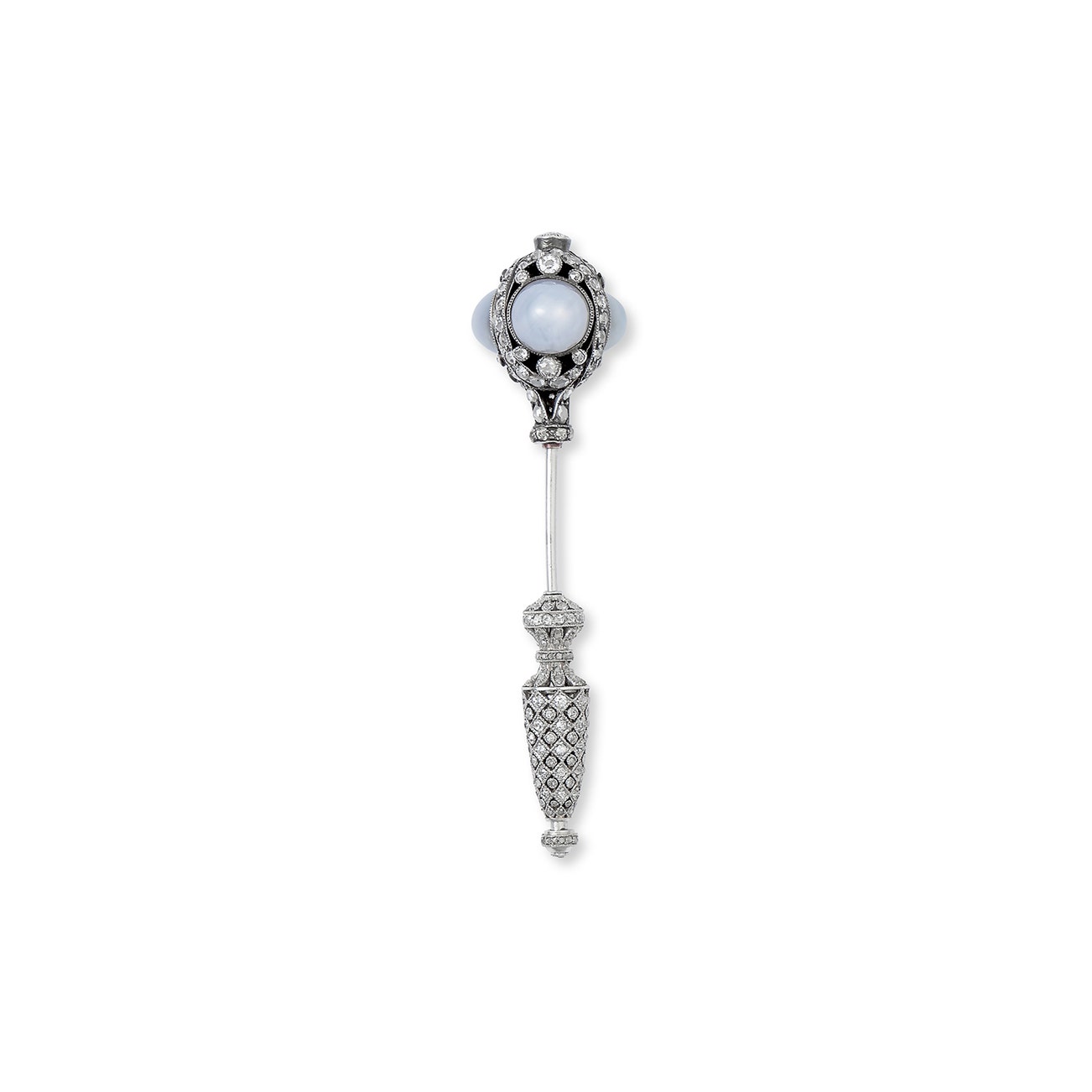Set with cabochon star sapphires, accented with circular- and single-cut diamonds, length approximately 75mm.