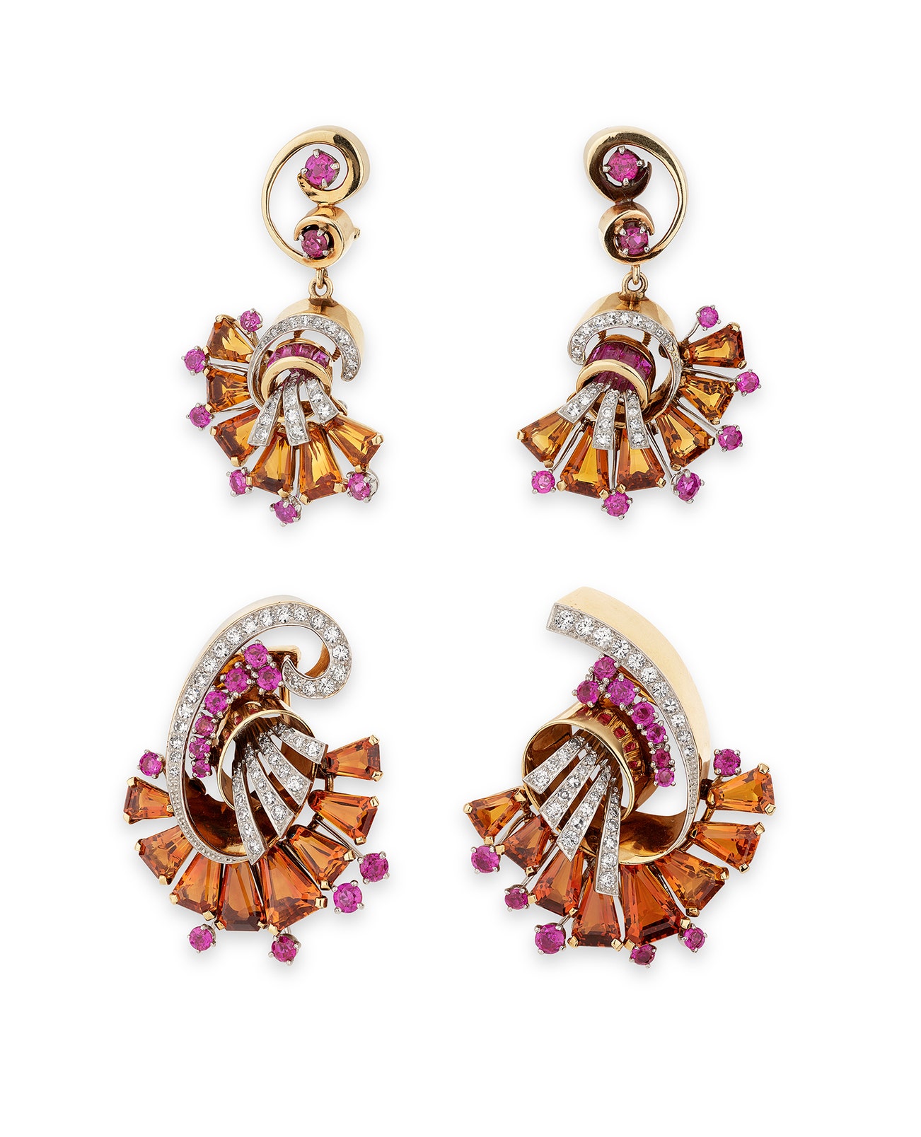 Comprising: a pair of ear clips, each set with trapeze-shaped citrines, circular-cut rubies and single-cut diamonds, each measuring approximately 45 x 27mm, and a pair of brooches, measuring approximately 40 x 35mm and 43 x 31mm.