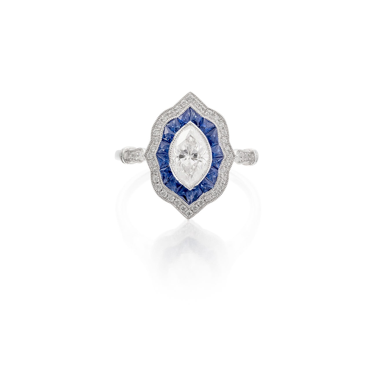 Set with a marquise-shaped diamond weighing 0.77 carats, accented with calibré-cut sapphires and brilliant-cut diamonds, size 53, signed Sabrina.