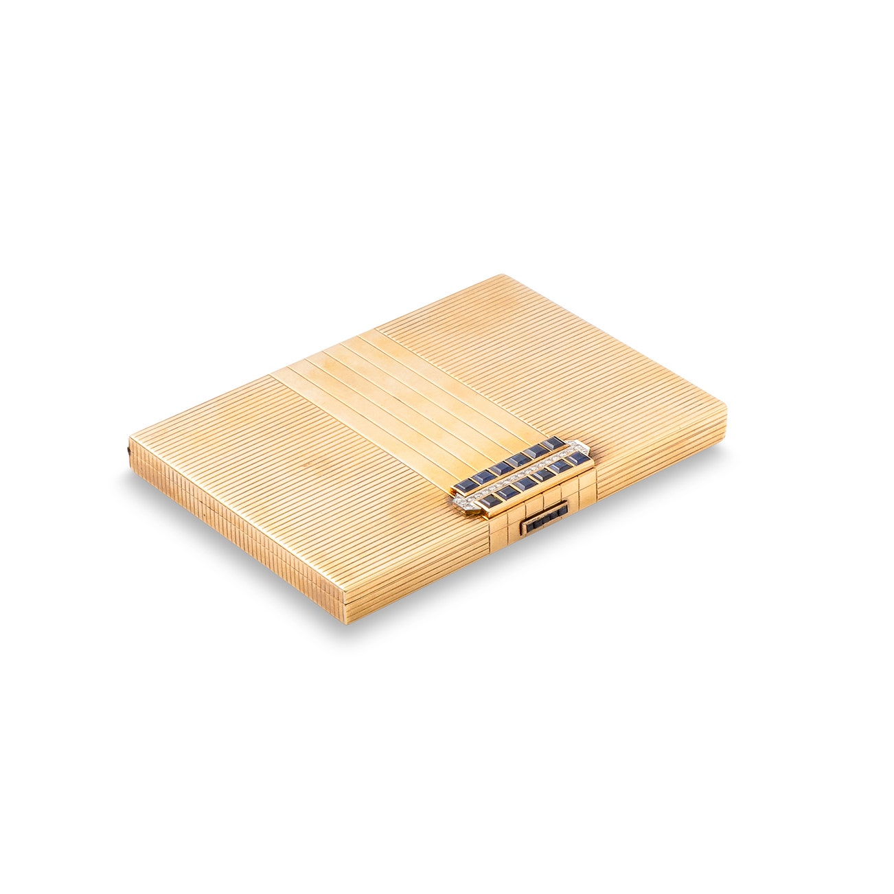 Of ribbed design, set with square step-cut sapphires and single-cut diamonds, measuring approximately 75 x 103mm.