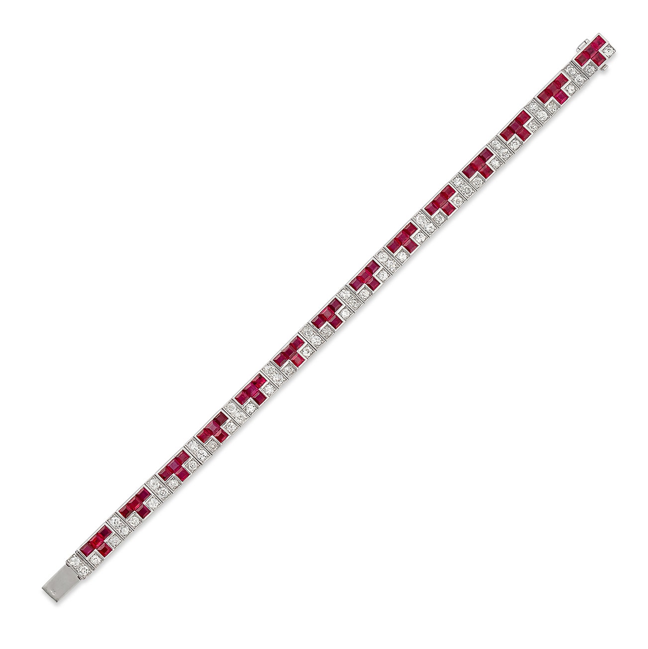 Set with calibré-cut rubies and brilliant-cut diamonds in geometric motifs,
