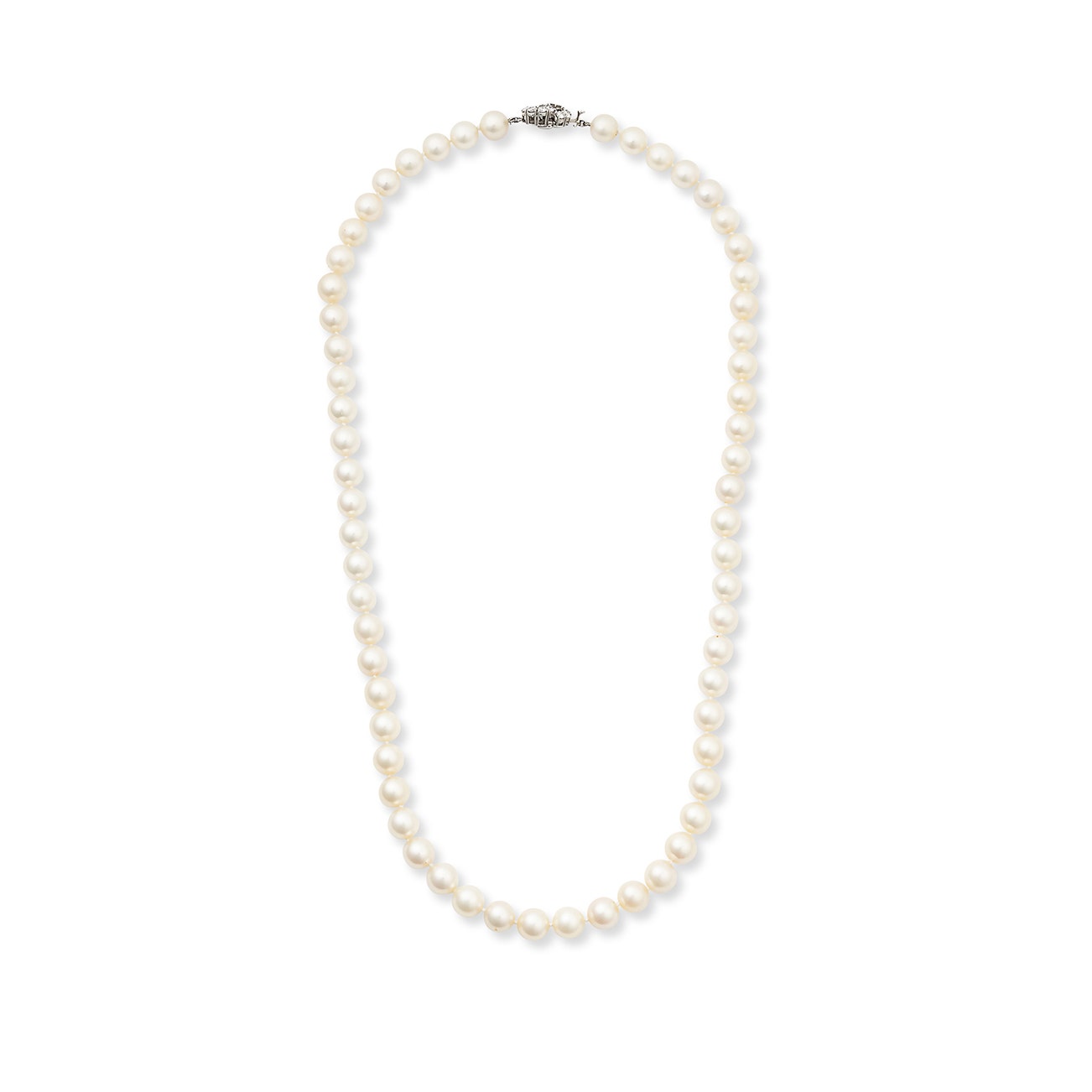 Composed of a single strand of cultured pearls measuring from approximately 8.53mm to 9.02mm, the clasp set with brilliant-cut diamonds, length approximately 596mm.