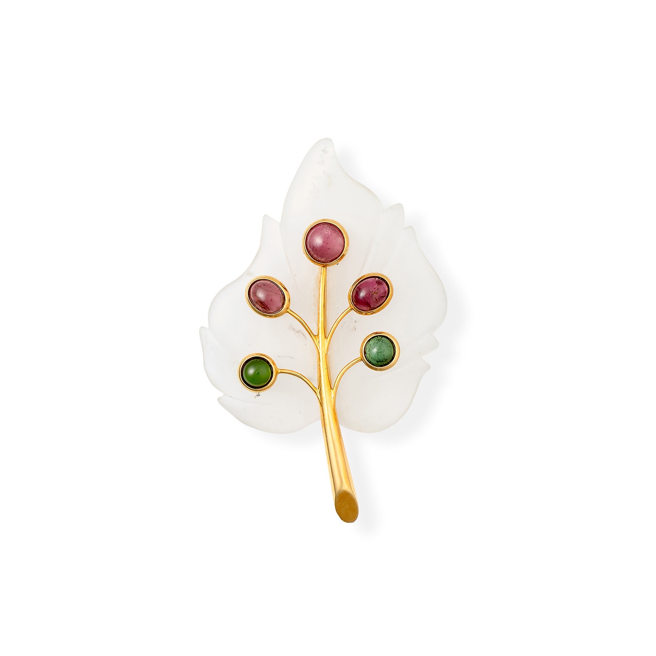 The carved and frosted rock crystal modelled as a leaf, set with purple and green cabochon tourmalines, measuring approximately 101 x 65mm.