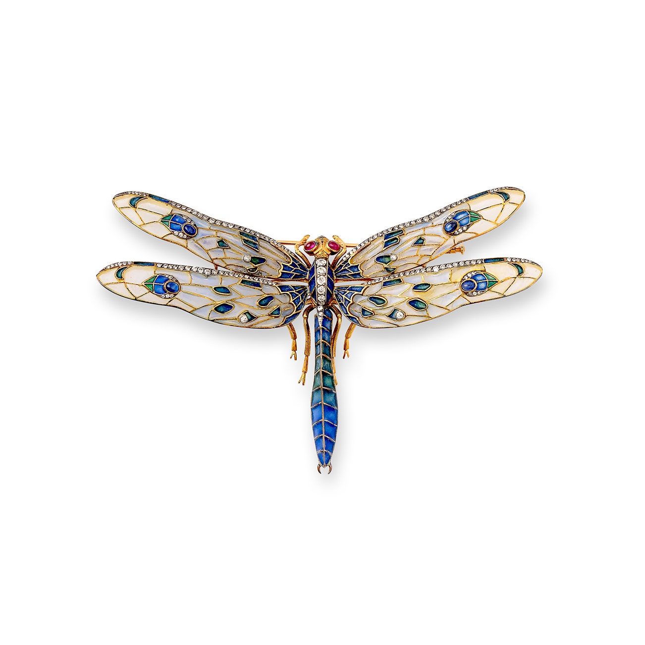 Modelled as a dragonfly, applied with polychrome enamel, embellished with cabochon sapphires and rubies and circular-cut diamonds, measuring approximately 66 x 100mm.