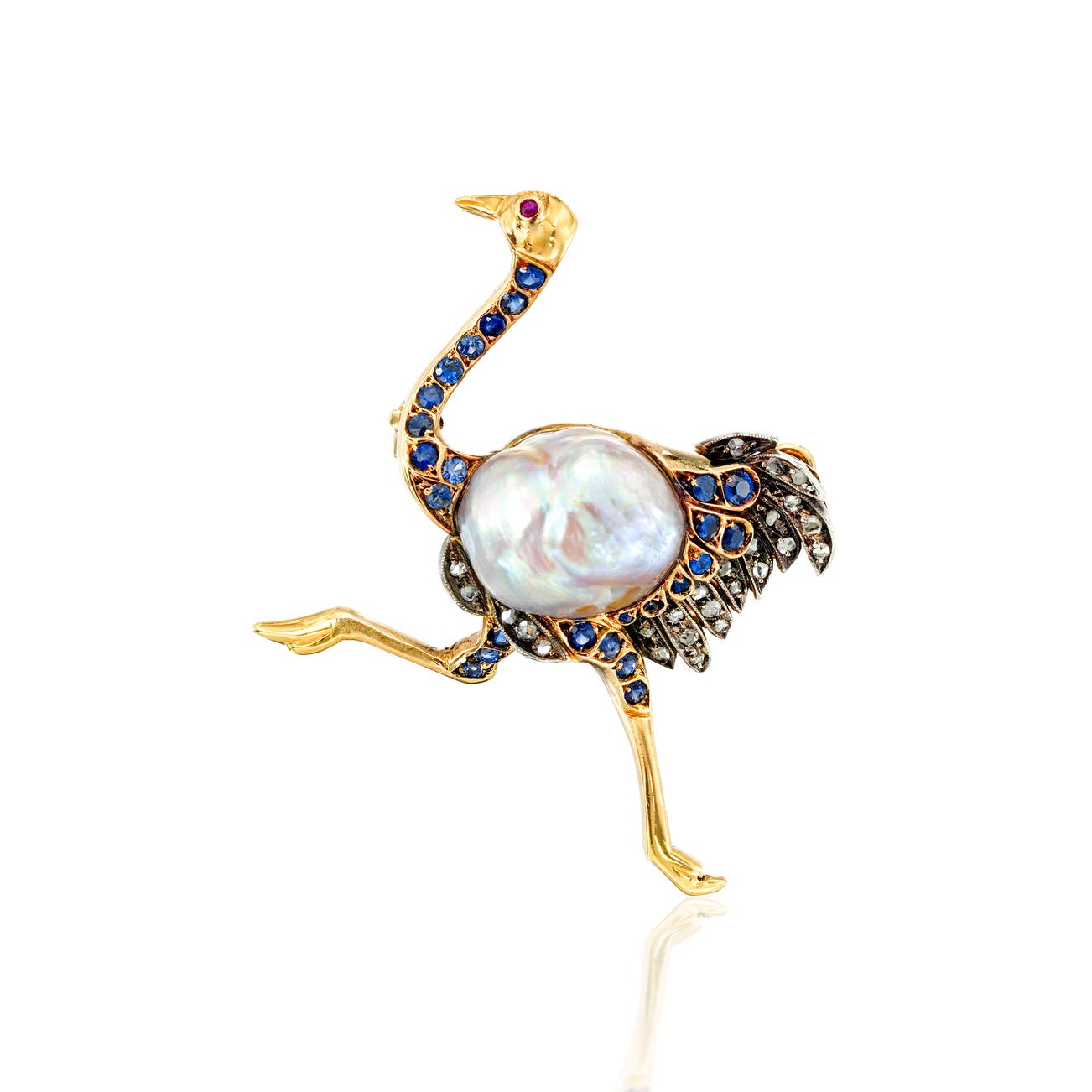 Modelled as a bird, set with a cultured pearl measuring approximately 13.25 x 11.40mm, accented with circular-cut sapphires and rose-cut diamonds, further accented by a circular-cut ruby eye, mounted in silver-topped 18k yellow gold, measuring approximately 1 1/2 x 1 1/4 inches.