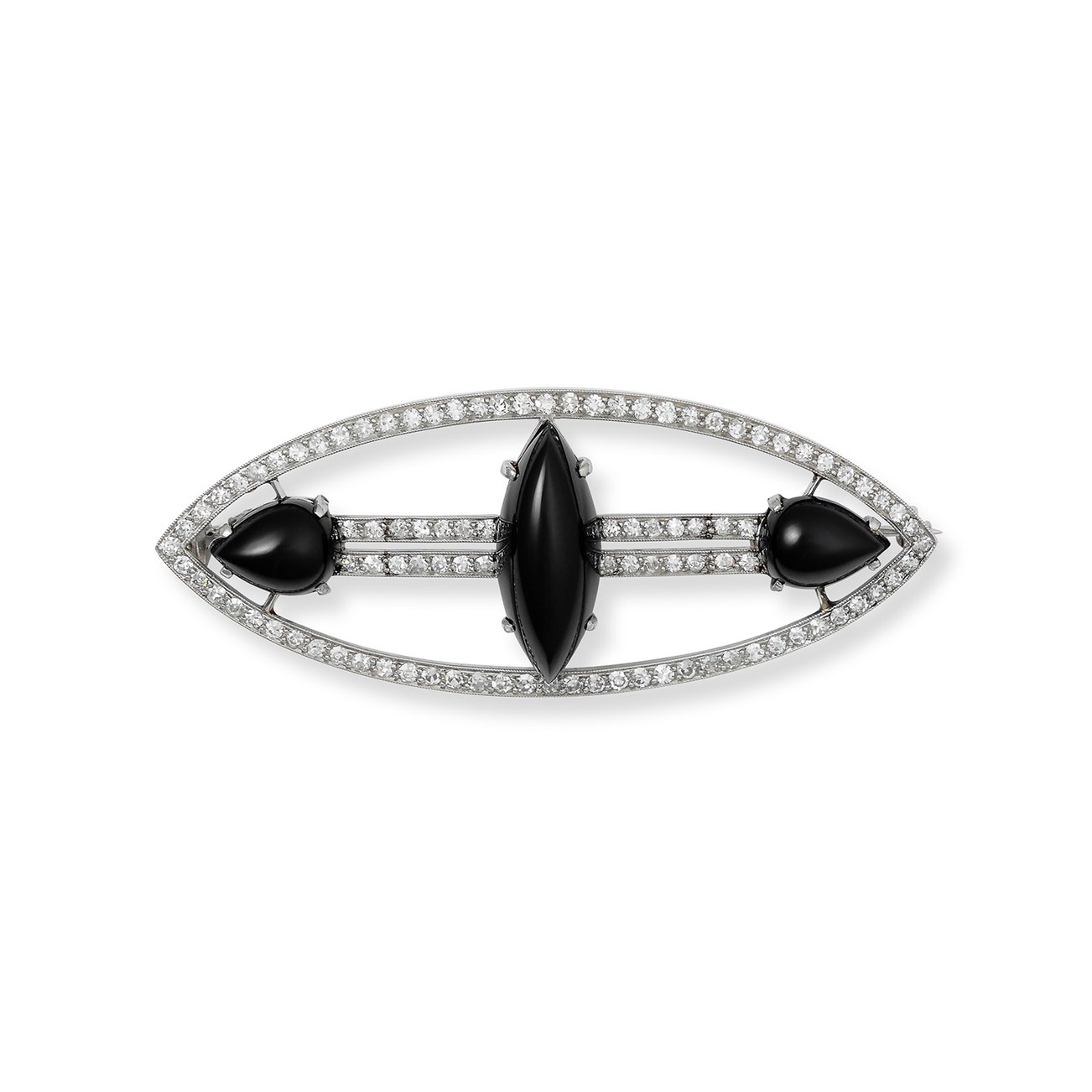 Set with marquise- and pear-shaped cabochon onyxes, highlighted with single-cut diamonds, measuring approximately 60 x 22mm.