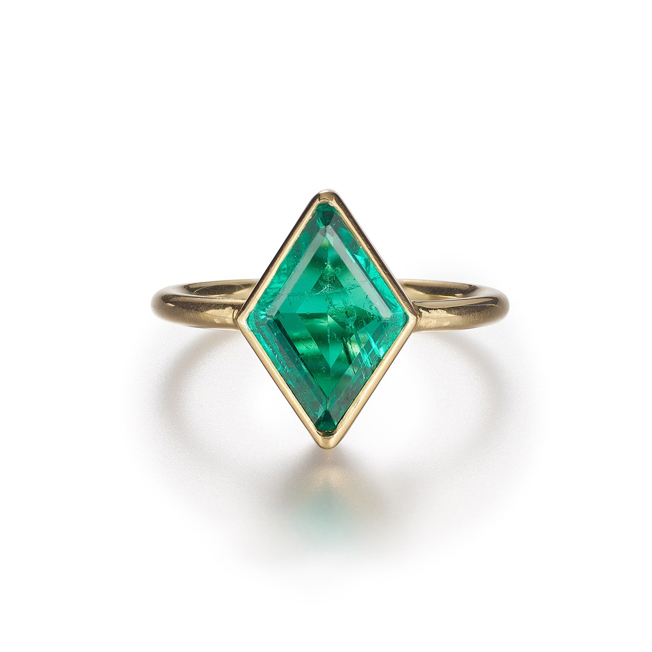 Set with a lozenge step-cut emerald weighing 2.10 carats,