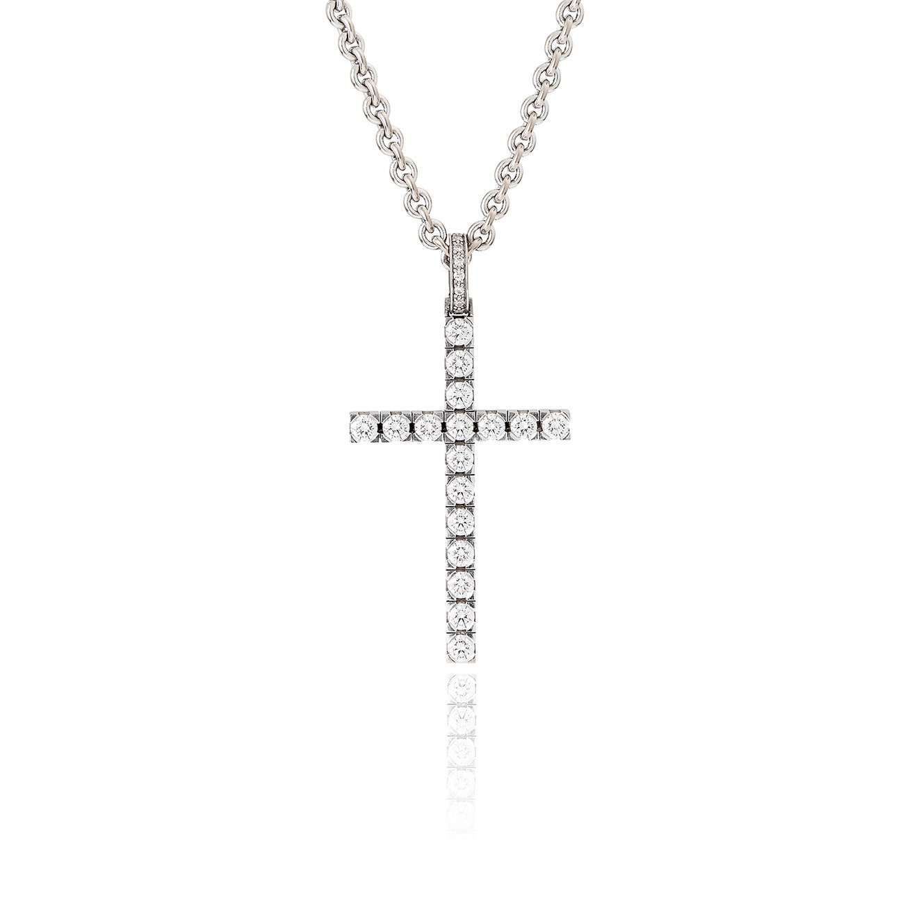The pendant designed as a cross, set with brilliant-cut diamonds, measuring approximately 56 x 30mm, suspended from a chain, length approximately 415mm.