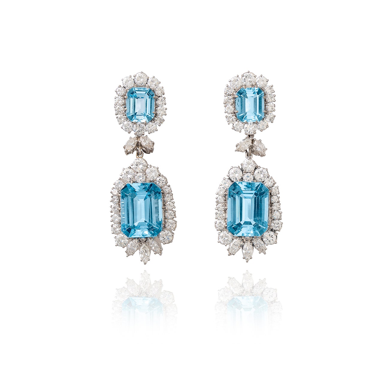 Each set with a step-cut topaz weighing 3.78 and 4.02 carats respectively, supporting a larger step-cut topaz weighing 14.11 and 14.46 carats respectively, accented with brilliant-cut and marquise-shaped diamonds, length approximately 57mm.
