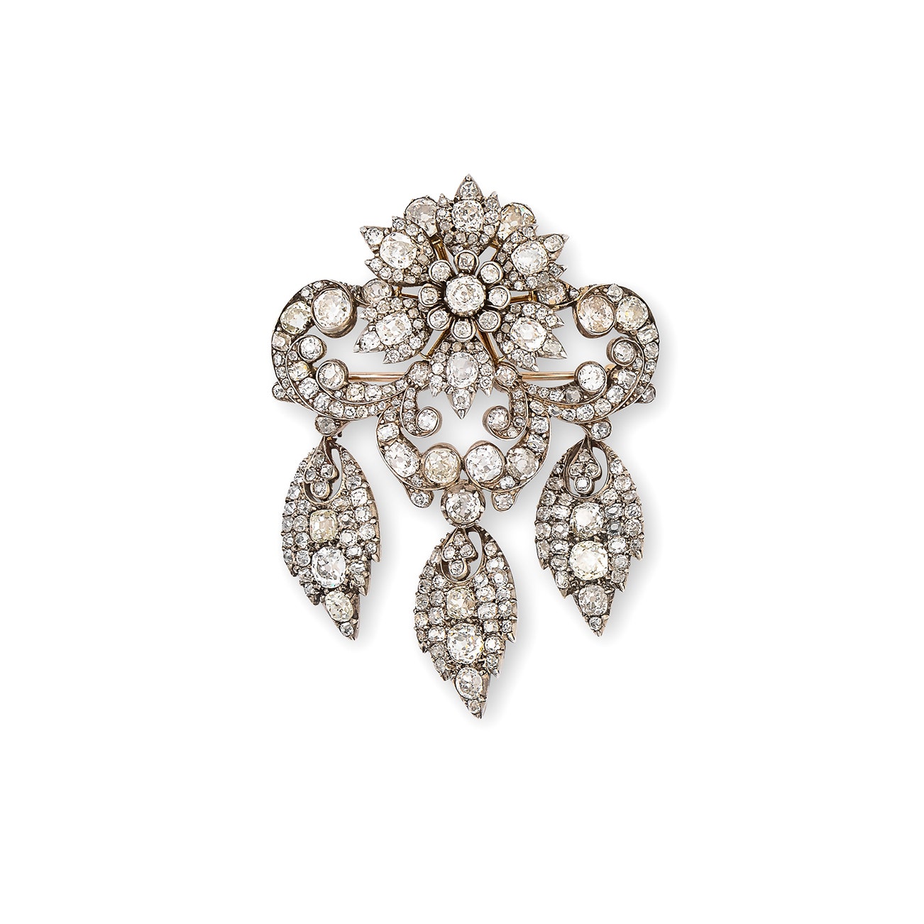 Of floral and foliate garland design, suspending three detachable drops, set throughout with circular- and rose-cut diamonds, measuring approximately 70 x 50mm, may be worn with the chain as a necklace, length approximately 390mm, fitted case stamped Harry & Gore.