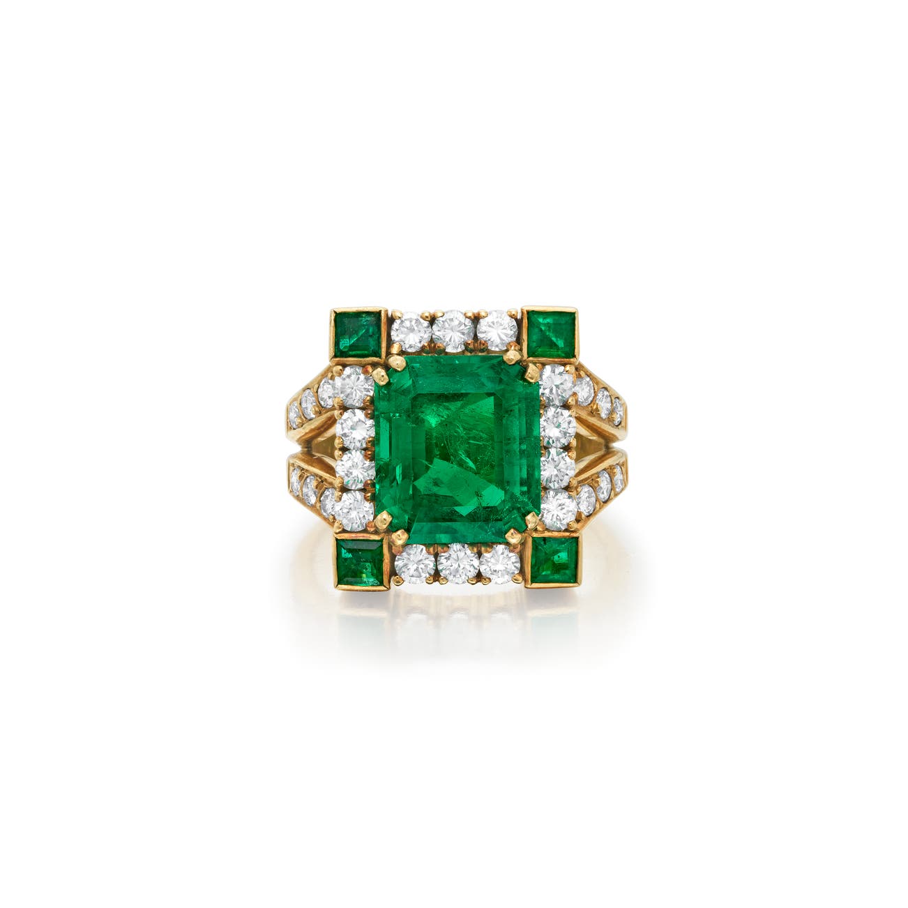Set with a step-cut emerald weighing approximately 5.03 carats, highlighted with square-cut emeralds and brilliant-cut diamonds, mounted in yellow gold, size 9 1/2.