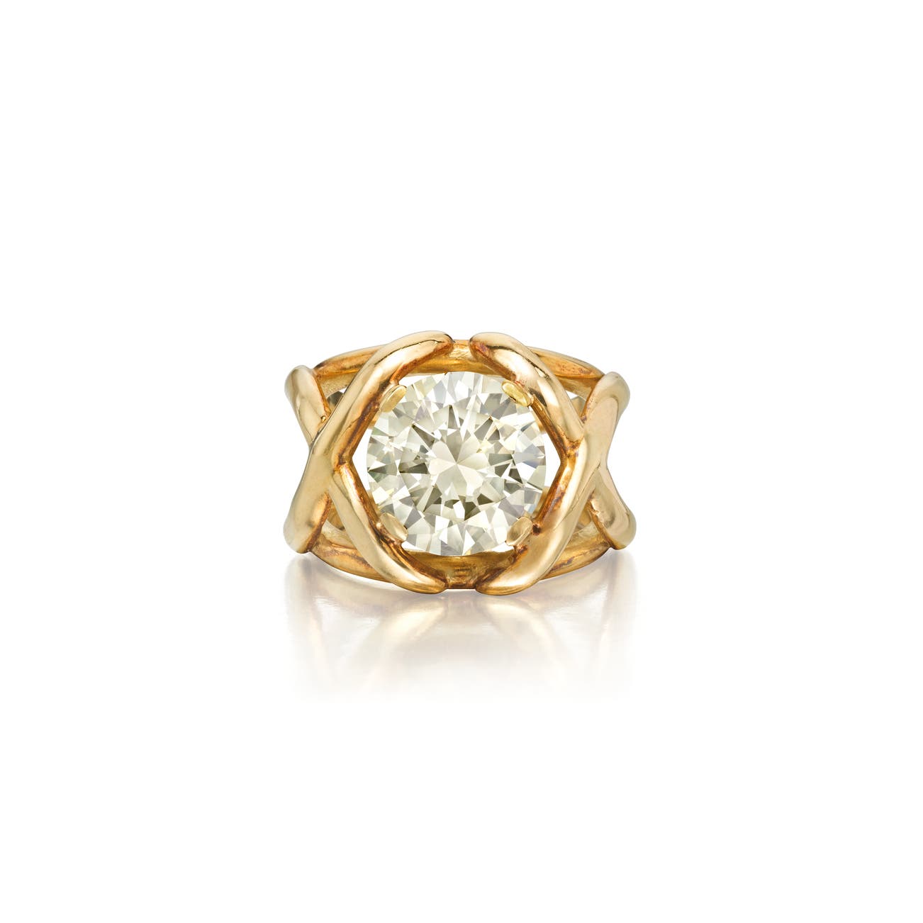 Set with a brilliant-cut fancy light brownish yellow diamond weighing 4.98 carats, mounted in 18k yellow gold, size 7.