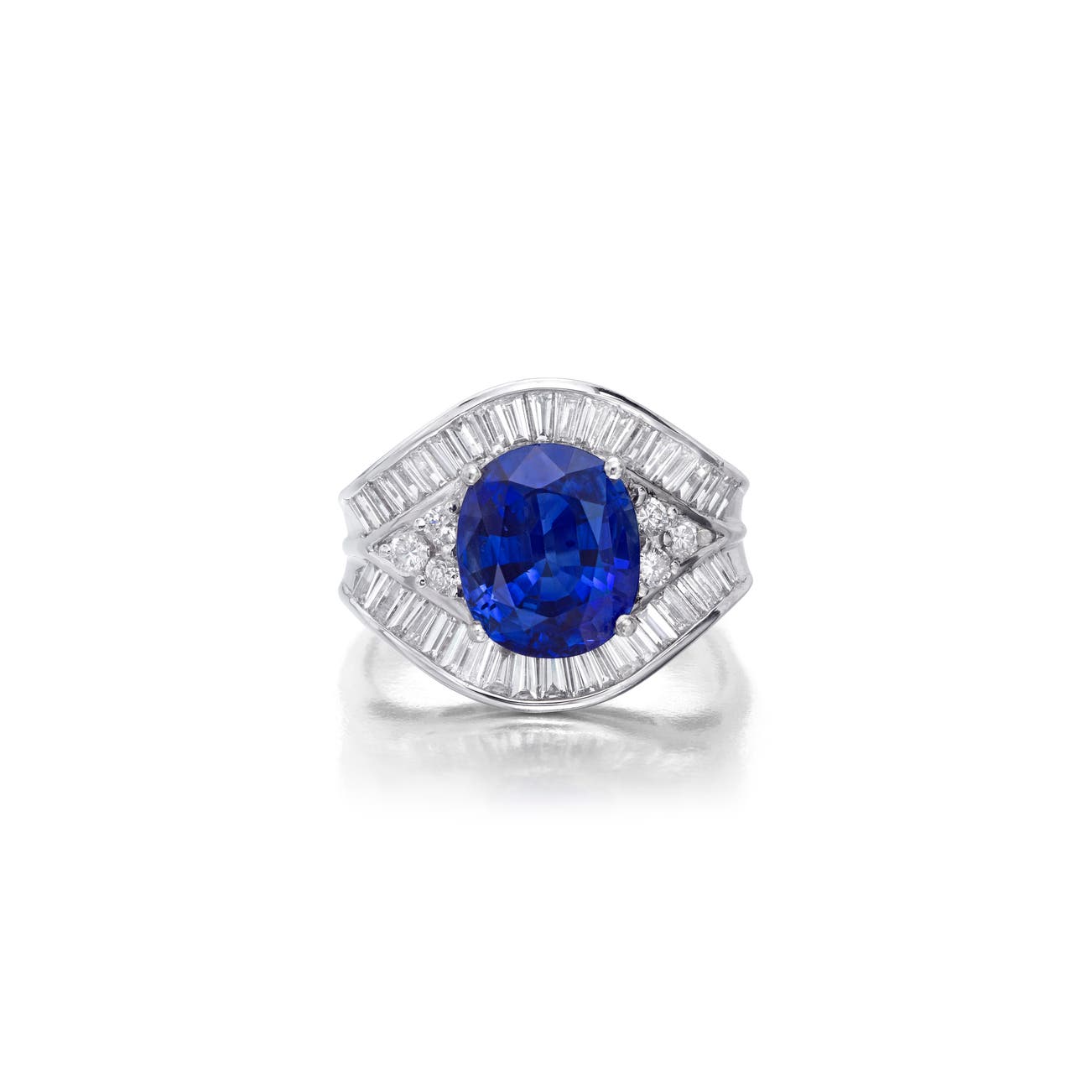 Set with an oval sapphire weighing 5.82 carats respectively, highlighted with baguette and brilliant-cut diamonds, mounted in 18k white gold, size 9 1/4.