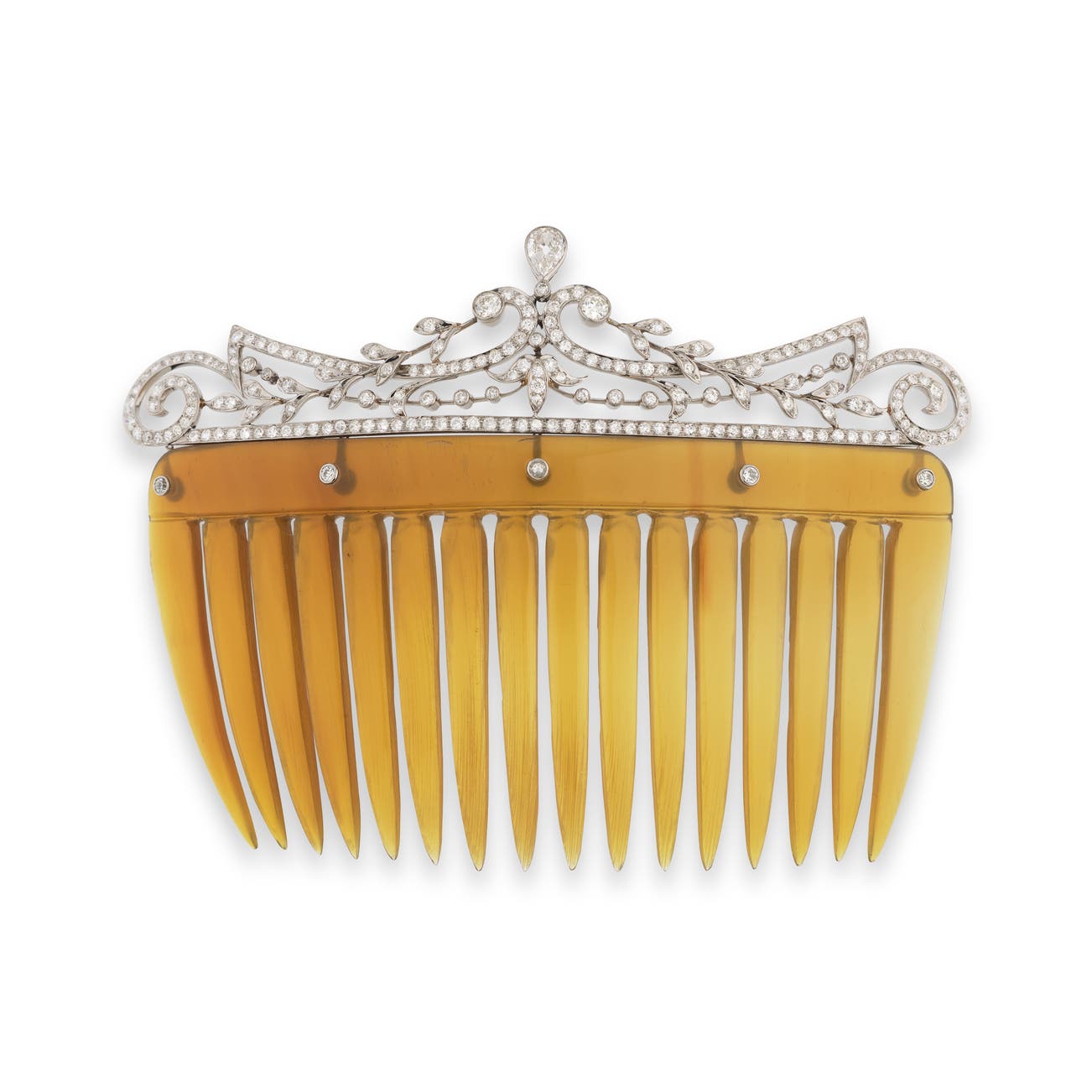 Of scroll and foliate design, set with a central pear-shaped diamond, further decorated with circular- and single-cut diamonds, attached to a horn comb later replaced, with circular-cut diamond screws, measuring approximately 150 x 78mm, mounted in platinum.