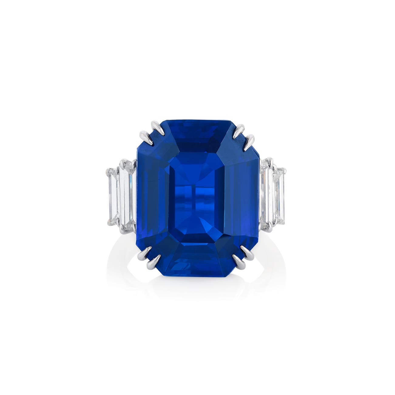 Set with an octagonal step-cut sapphire weighing 18.09 carats, between baguette diamond shoulders, size 47.