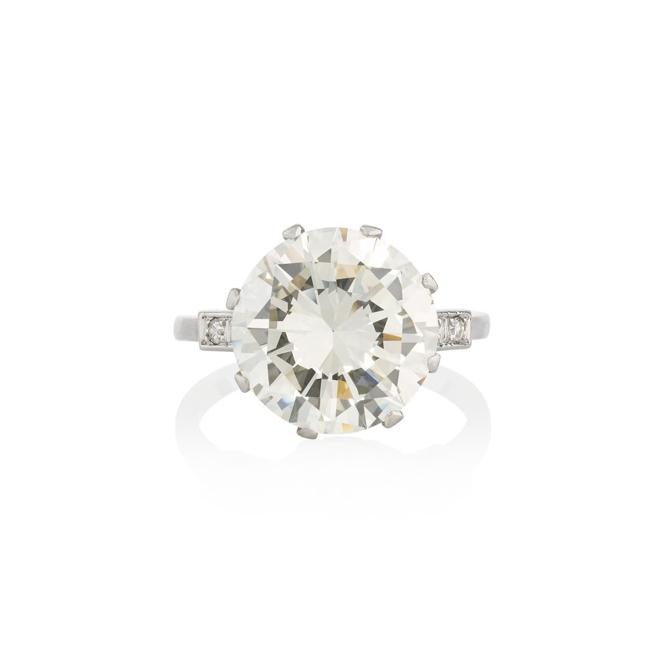 Set with a circular-cut diamond weighing 6.57 carats, the shoulders accented with single-cut diamonds, size 53.