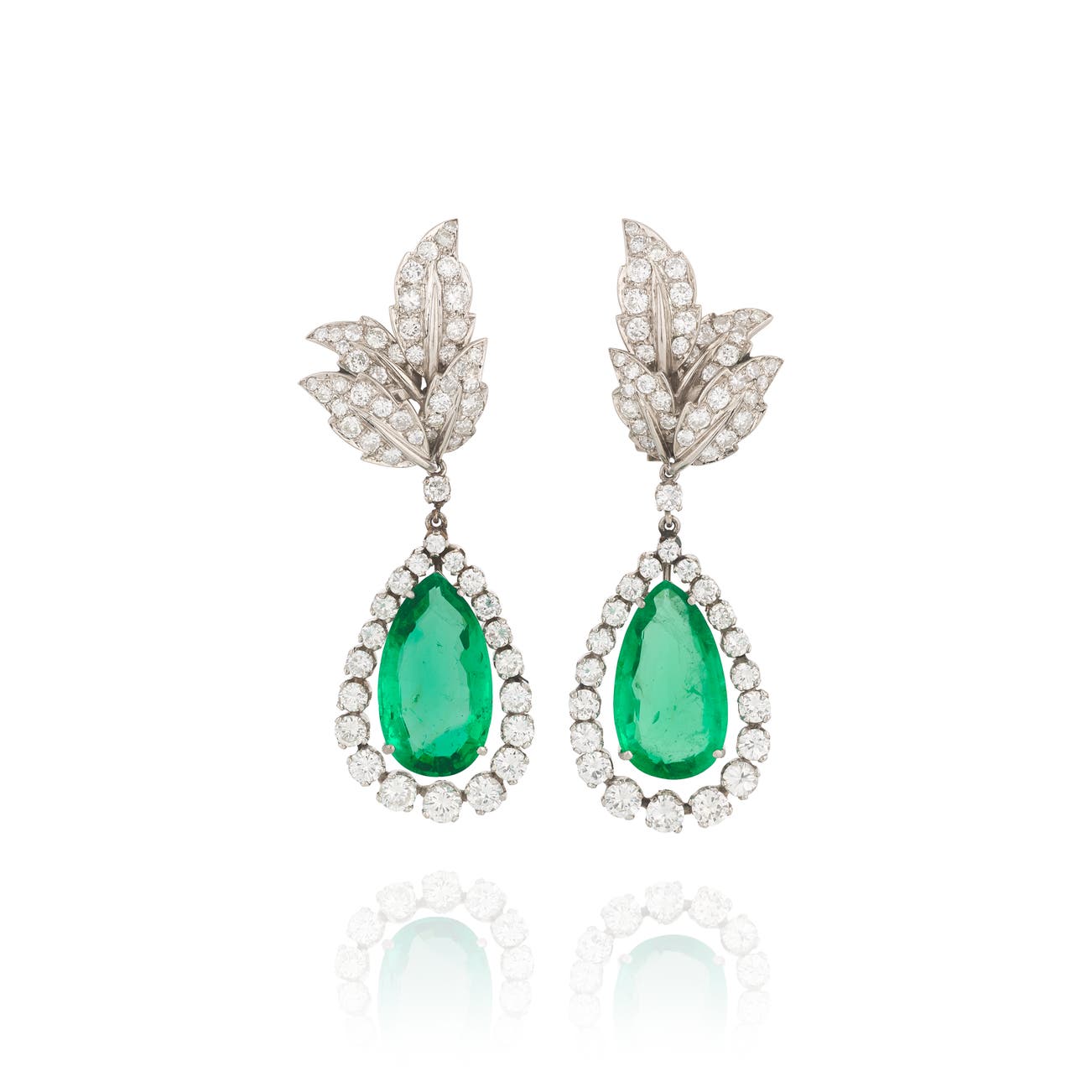 Of foliate design, each set with brilliant- and single-cut diamonds, supporting a pear-shaped emerald weighing 8.85 and 8.46 carats respectively, within a brilliant-cut diamond surround, length approximately 60mm.