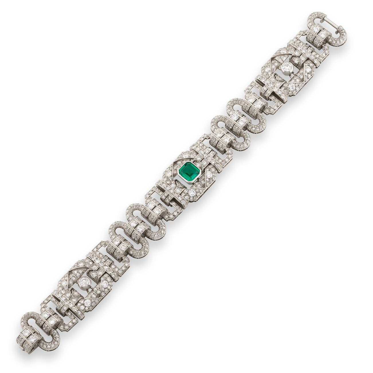 Of geometric design, set with a central step-cut emerald, accented with circular-, rose-, and single-cut diamonds, length approximately 195mm.