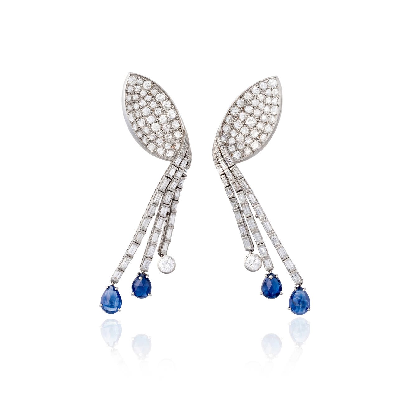 Set with brilliant-cut and baguette diamonds, supporting briolette sapphires, each measuring approximately 74x17mm, post and hinged-back fittings.