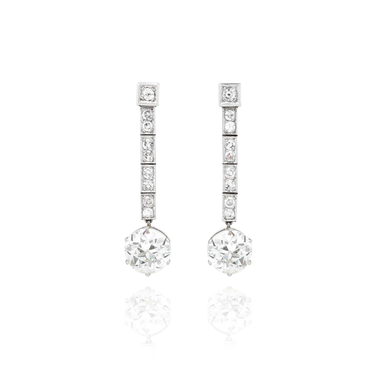 Designed as a flexible line accented with circular- and single-cut diamonds, supporting a circular-cut diamond weighing 2.54 and 2.18 carats respectively, screw-back fittings.