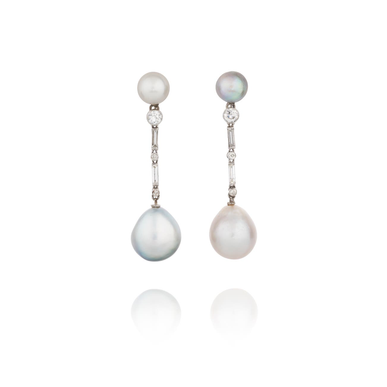 Each set with a button-shaped natural pearl measuring approximately 7.45-7.50 x 8.20mm and 7.30-7.50 x 6.45mm respectively, supporting a line of alternating circular-cut and baguette diamonds, terminating to a slightly baroque drop-shaped natural pearl measuring approximately 9.90-11.70 x 12.85mm and 9.80-11.15 x 12.80mm respectively, length approximately 48mm, French maker's mark and assay mark for gold, screw-back fittings.