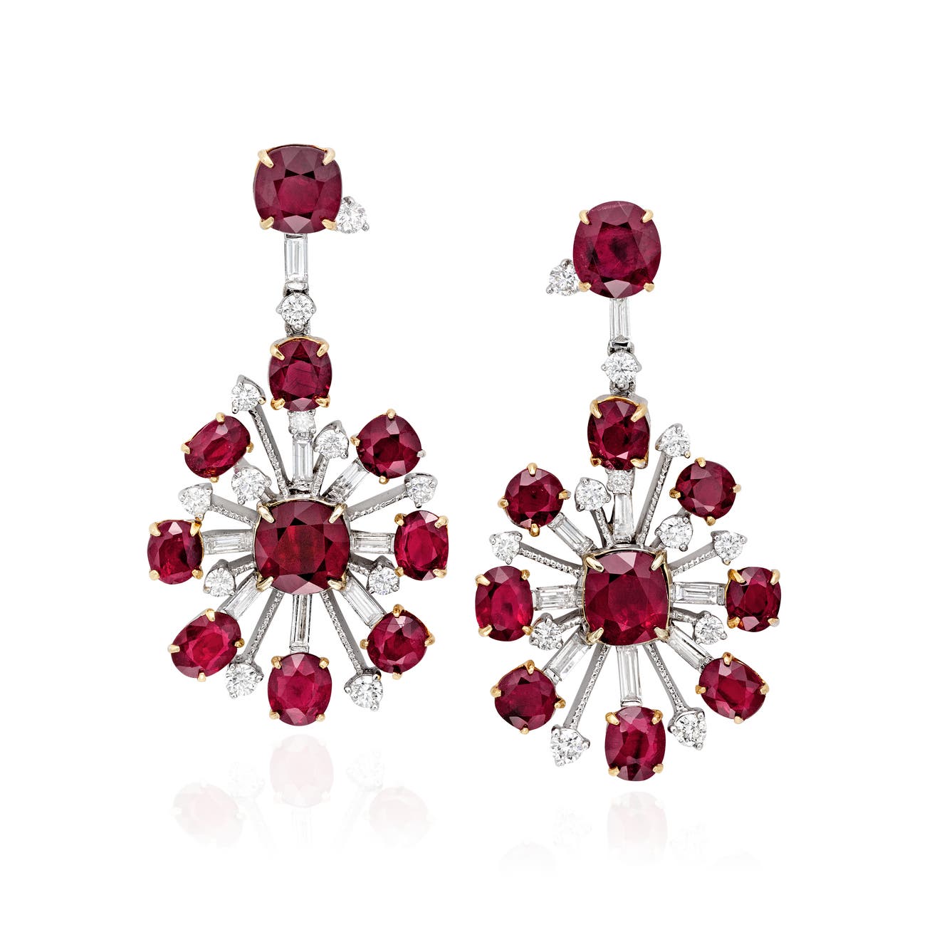 Each set with cushion-shaped, oval, and circular-cut rubies weighing a total of 8.58 carats respectively, accented by brilliant-cut diamonds weighing a total of 1.07 carats respectively, mounted in 18k white gold, length approximately 1 1/4 inches.