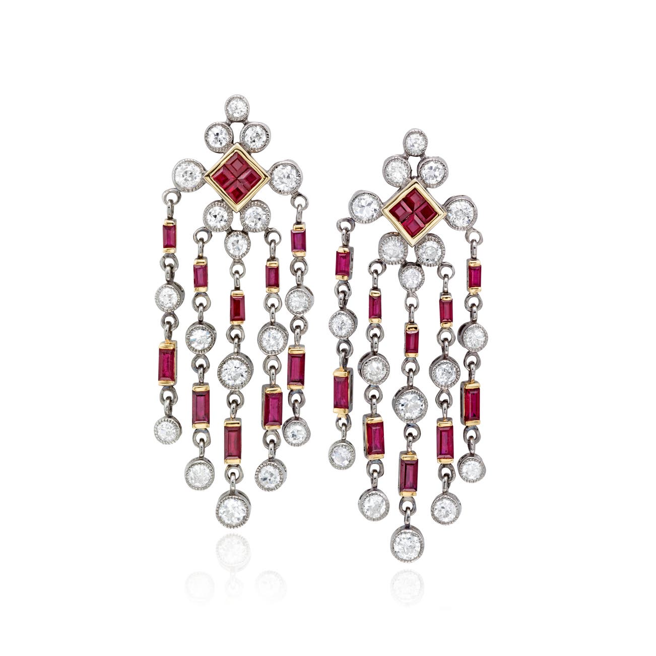 Each centering square-cut rubies, accented by collet-set circular-cut diamonds, suspending circular-cut diamonds and step-cut rubies, mounted in 18k white and yellow gold, length approximately 2 inches.