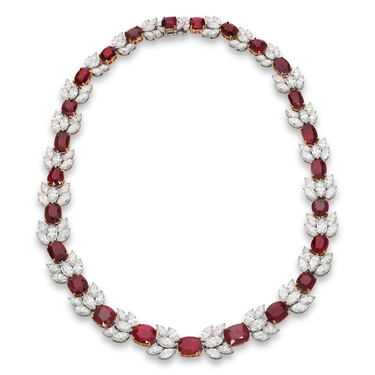 Set with graduating cushion-shaped and oval rubies, accented with clusters of marquise-shaped diamonds, length approximately 415mm.