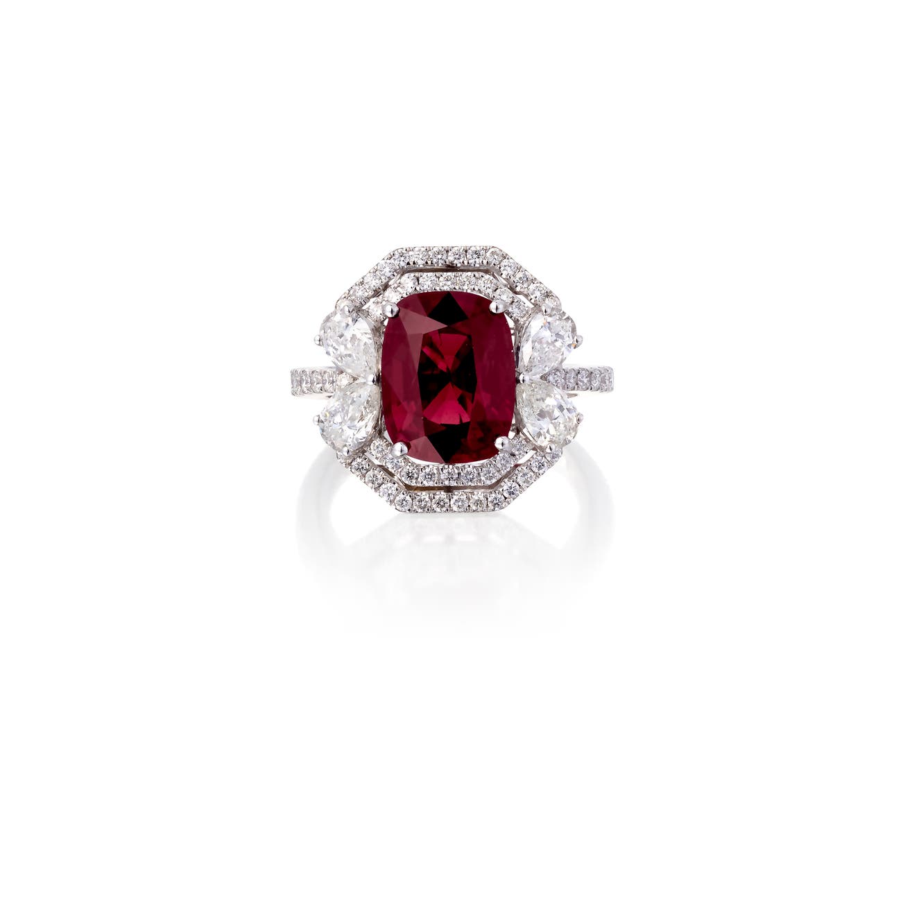 Set with a cushion-shaped spinel weighing 4.45 carats, embellished with pear-shaped and brilliant-cut diamonds, size 54.