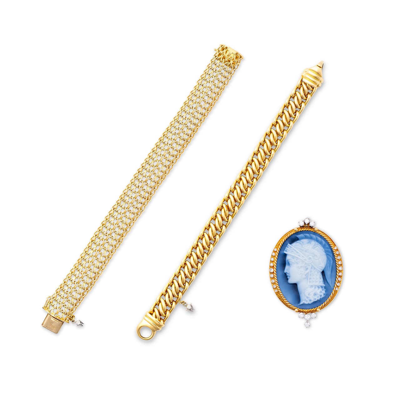 Agate and diamond cameo brooch and two gold bracelets