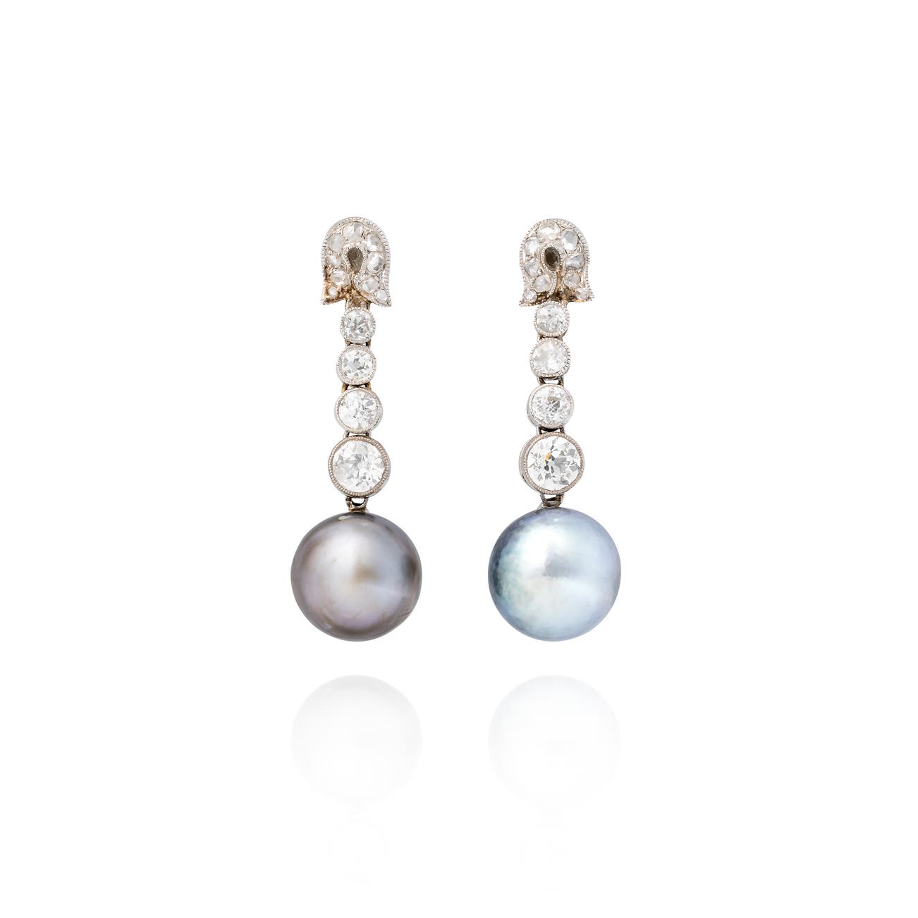 Each set with a button-shaped natural pearl measuring approximately 10.70-10.75 x 9.80mm and 10.45-10.55 x 8.80mm respectively, suspended from a graduating line of circular-cut diamonds, to a surmount of foliate design embellished with rose-cut diamonds, length approximately 39mm, French import marks for gold and platinum, screw-back fittings.