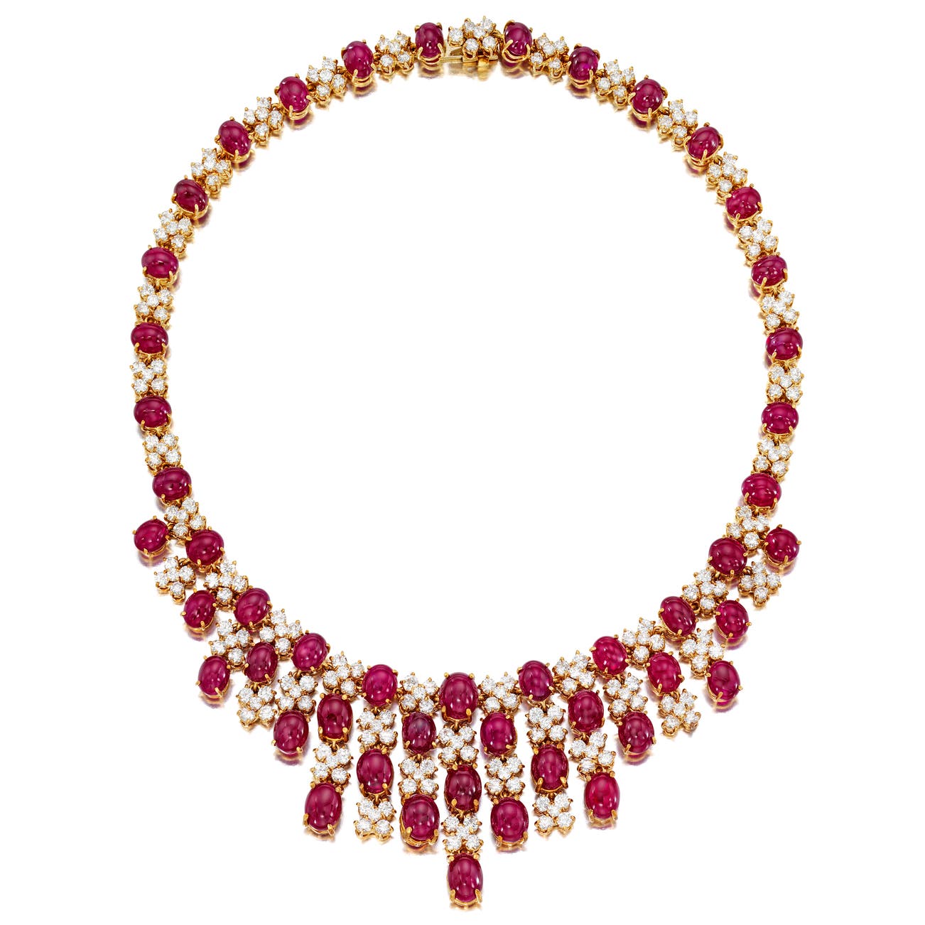 Of fringe design, set with cabochon rubies, decorated with brilliant-cut diamonds throughout, mounted in 18k yellow gold, length approximately 16 1/2 inches.