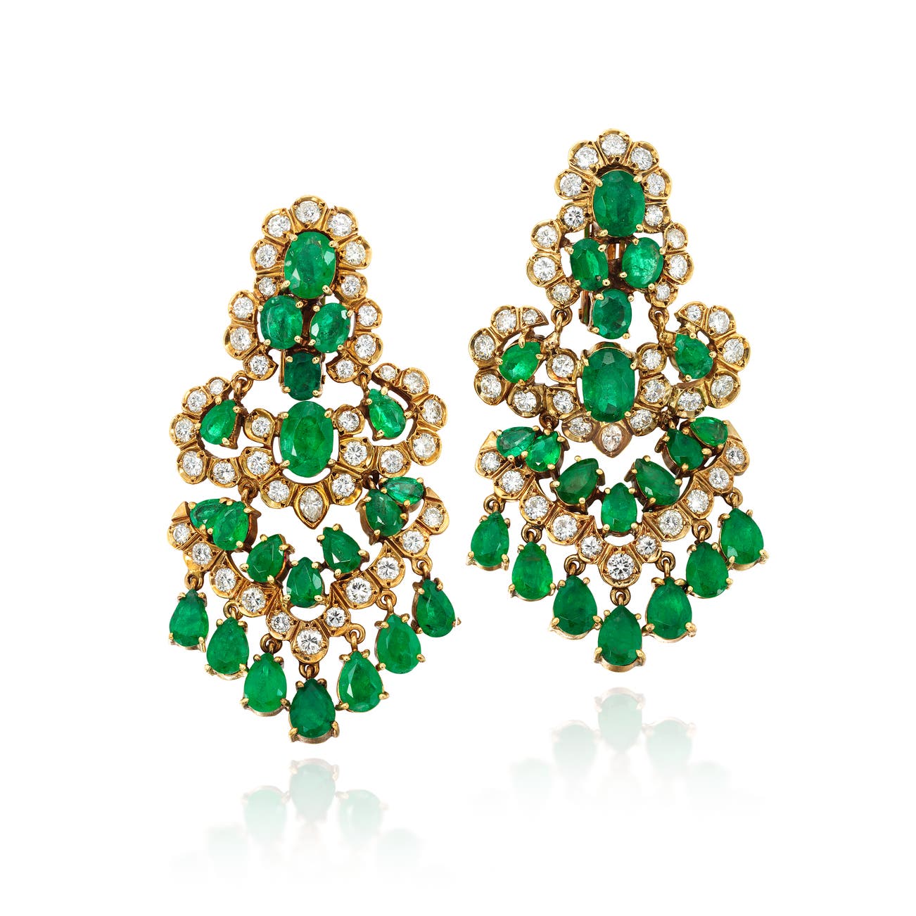 Each set with oval and pear-shaped emeralds, accented by brilliant-cut diamonds, mounted in yellow gold, measuring approximately 2 1/2 inches.