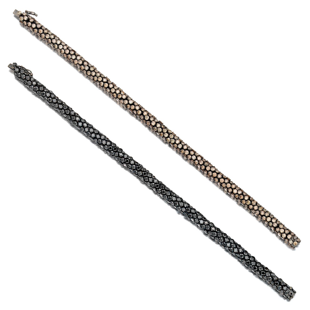 Of flexible design, one set with brilliant-cut diamonds of brown tint, one set with similarly-cut diamonds of black tint, each mounted in 18k blackened gold, measuring approximately 7 inches in length.