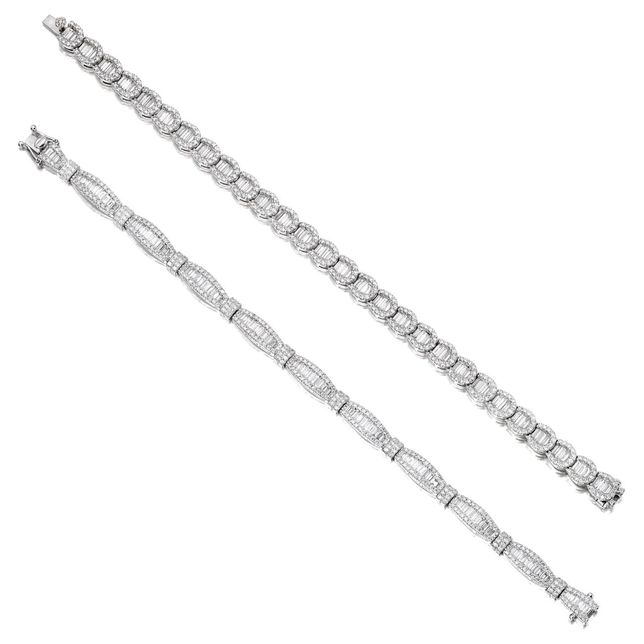 One bracelet set with baguette and brilliant-cut diamonds, mounted in 18k white gold, length approximately 7 inches, and one bracelet set with baguette and brilliant-cut diamonds, mounted in 18k white gold, measuring approximately 7 inches, with Italian maker's mark.