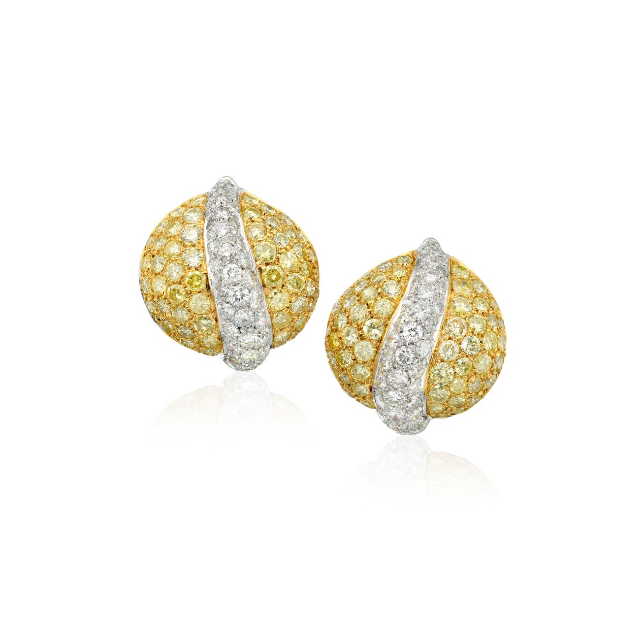 Each set with brilliant-cut diamonds and brilliant-cut diamonds of yellow tint, mounted in 18k white gold, measuring approximately 7/8 inches. Please note that the diamonds of yellow tint have not been tested for natural color.