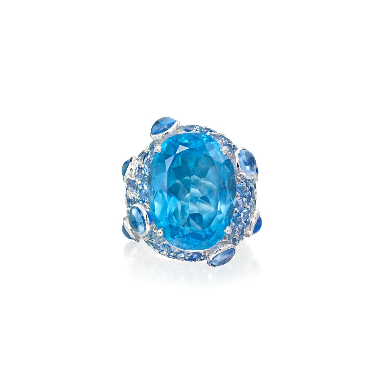Centering an oval blue topaz measuring approximately 19.9 x 15.0 x 9.8mm, surrounded by circular-cut and cabochon aquamarines, mounted in platinum, size 7.