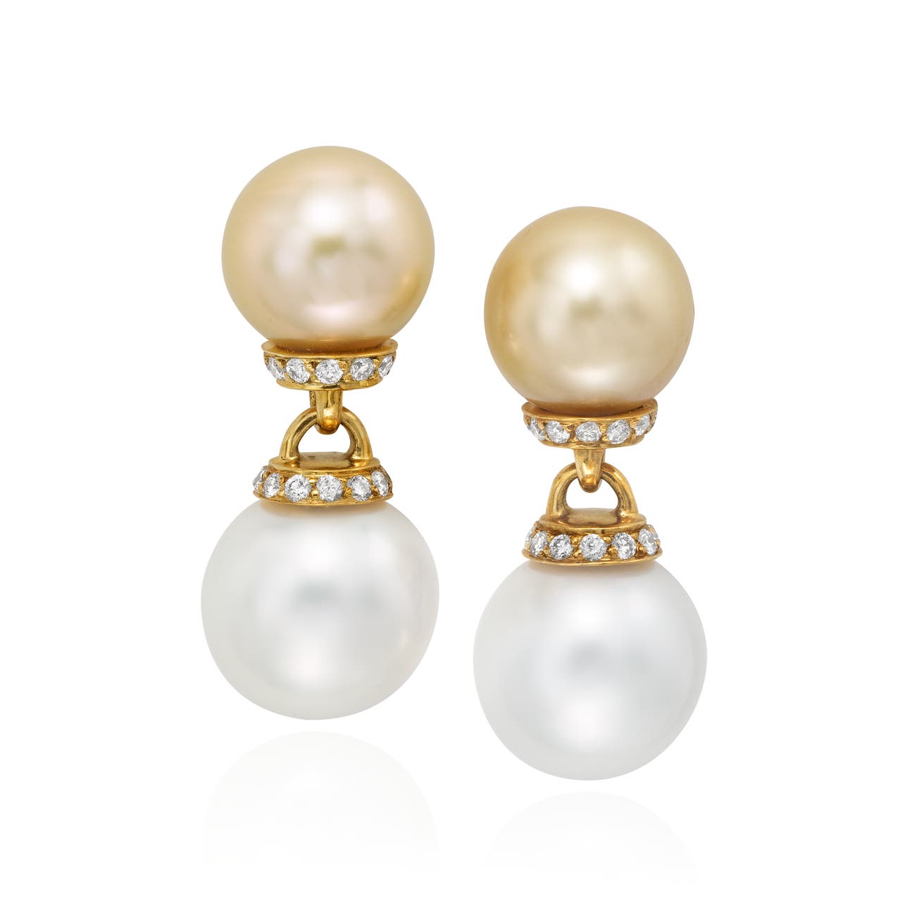 Each set with a pearl measuring approximately 11.9-12.0 x 11.0mm, suspending another pearl measuring approximately 13.3-13.4 x 12.6mm, accented by brilliant-cut diamonds, mounted in yellow gold, measuring approximately 1 1/4 inches.
