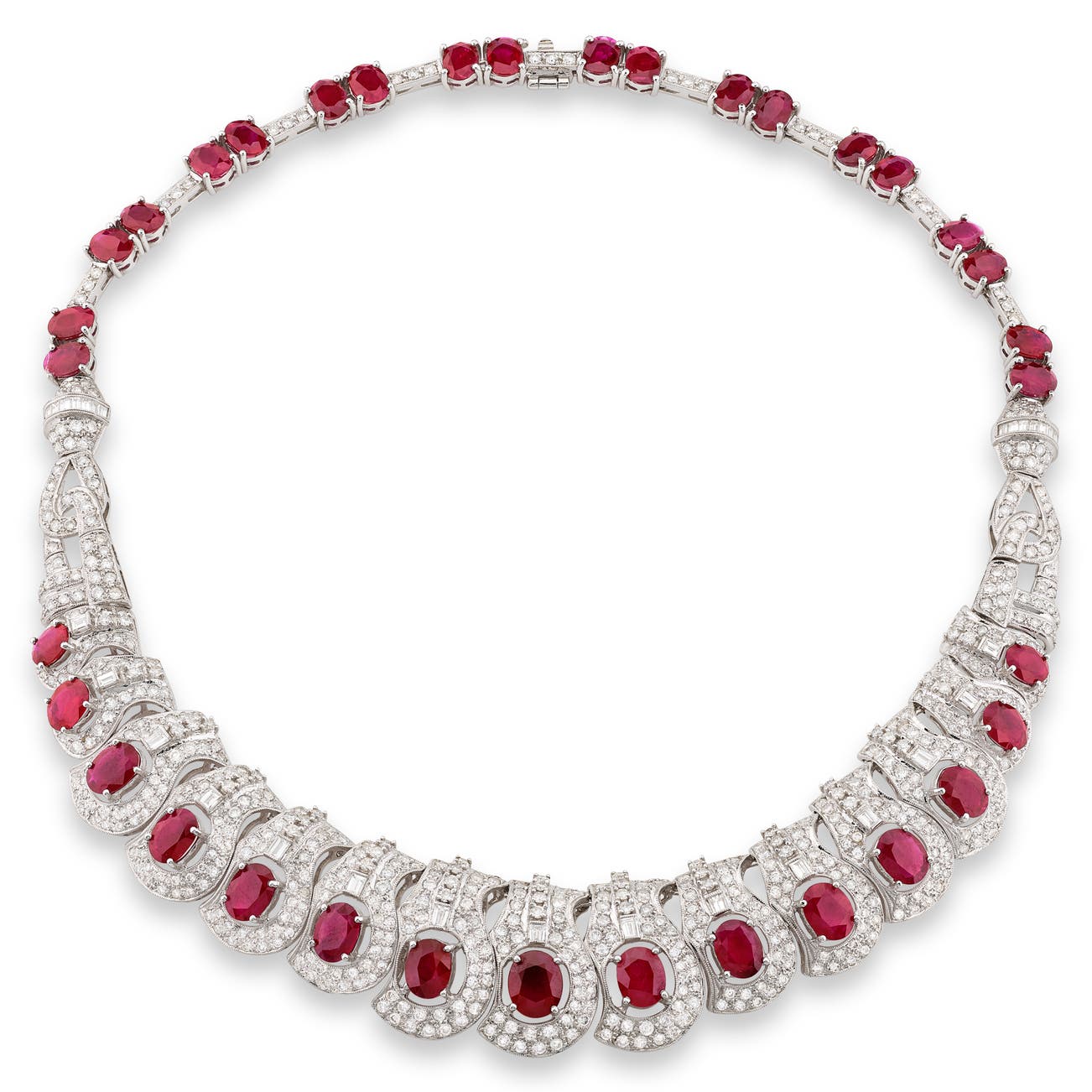 Set with graduating oval rubies, highlighted with brilliant-cut and baguette diamonds, inner circumference approximately 400mm.