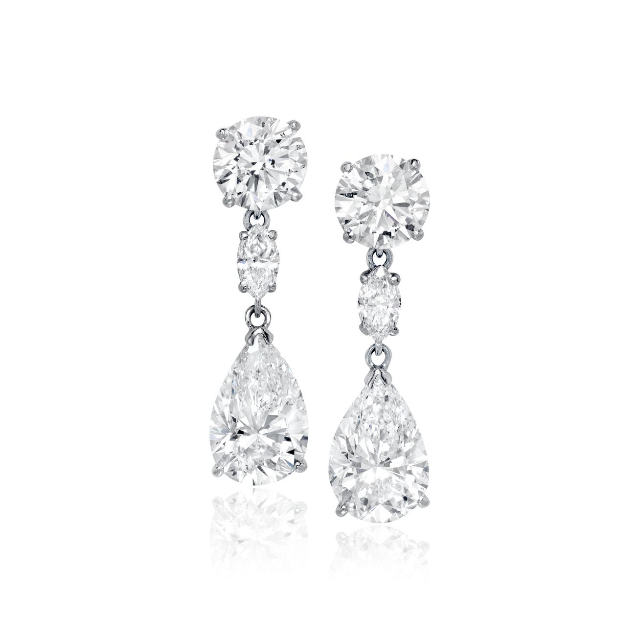 Each set with a brilliant-cut diamond weighing 2.11 and 2.15 carats respectively, supporting a pear-shaped diamond weighing 4.00 and 3.99 carats respectively, from a smaller marquise-cut diamond, mounted in platinum, length approximately 1 1/4 inches.