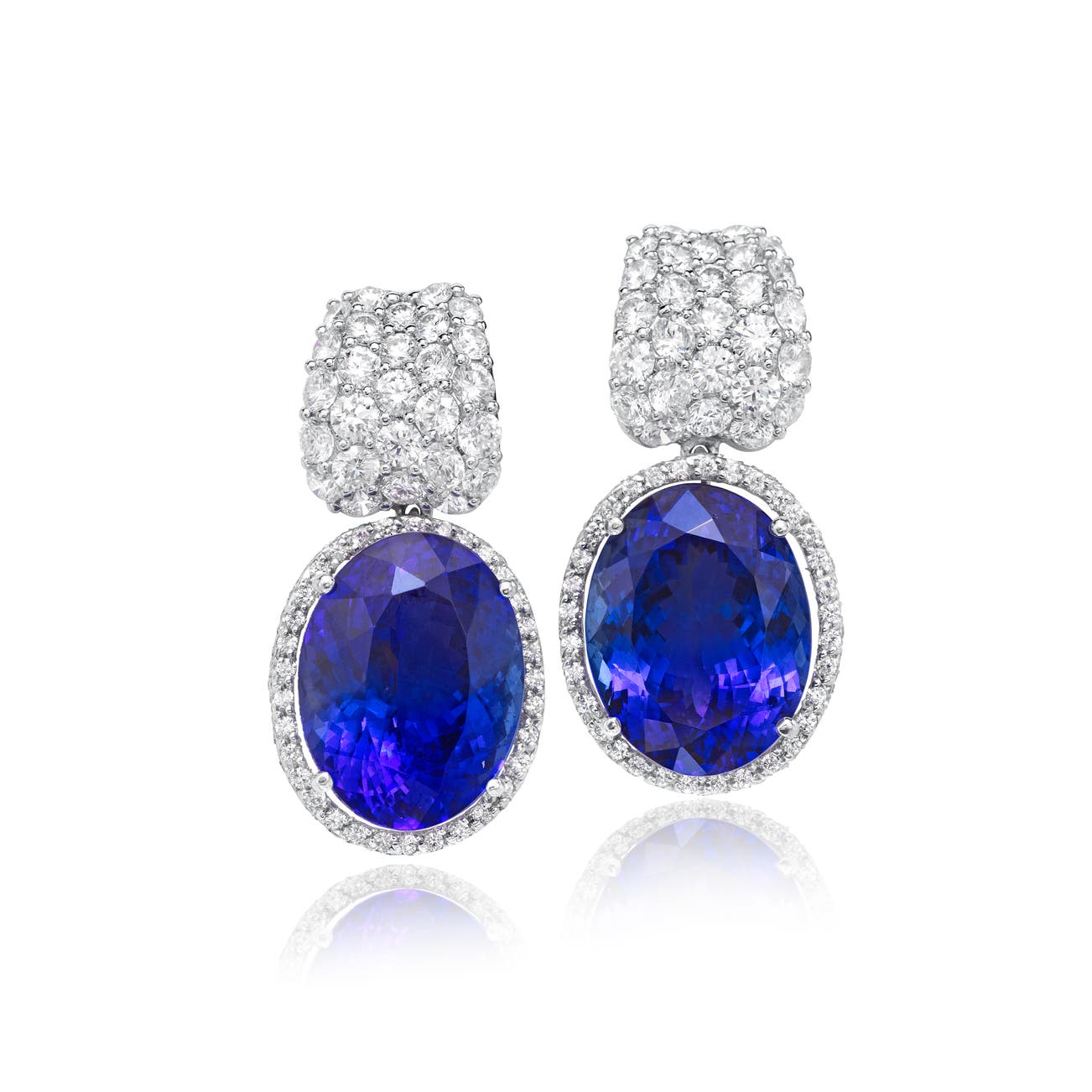 Each set with an oval tanzanite measuring approximately 18.6 x 14.4 x 9.2mm and 18.8 x 14.4 x 10.9mm respectively, enhanced by brilliant-cut diamonds, mounted in 18k white gold, length approximately 1 1/4 inches.
