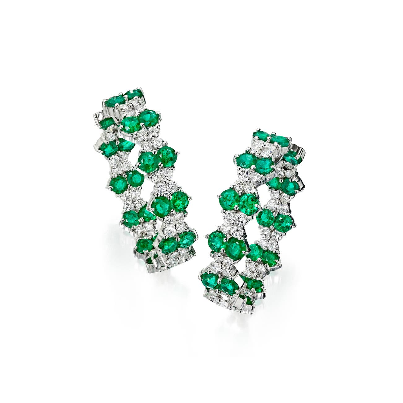 Designed as hoops, set with circular-cut emeralds and brilliant-cut diamonds, mounted in 18k white gold, measuring approximately 1 3/4 inches.