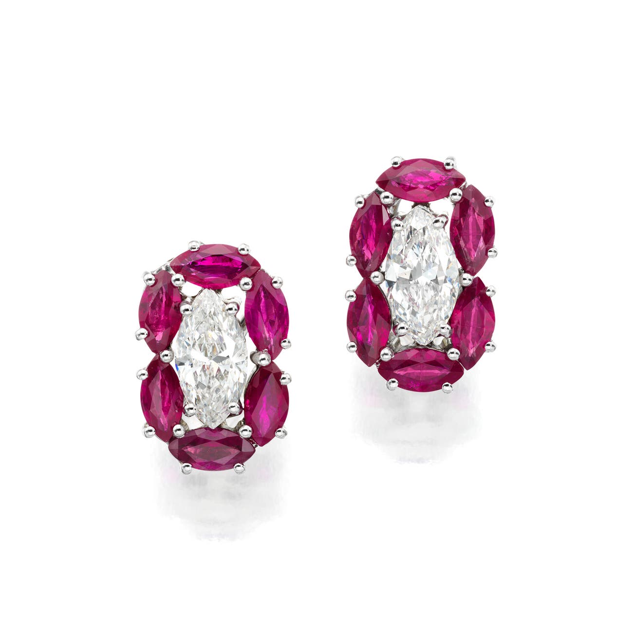 Set with a marquise-shaped diamond, within a frame of marquise-shaped rubies,