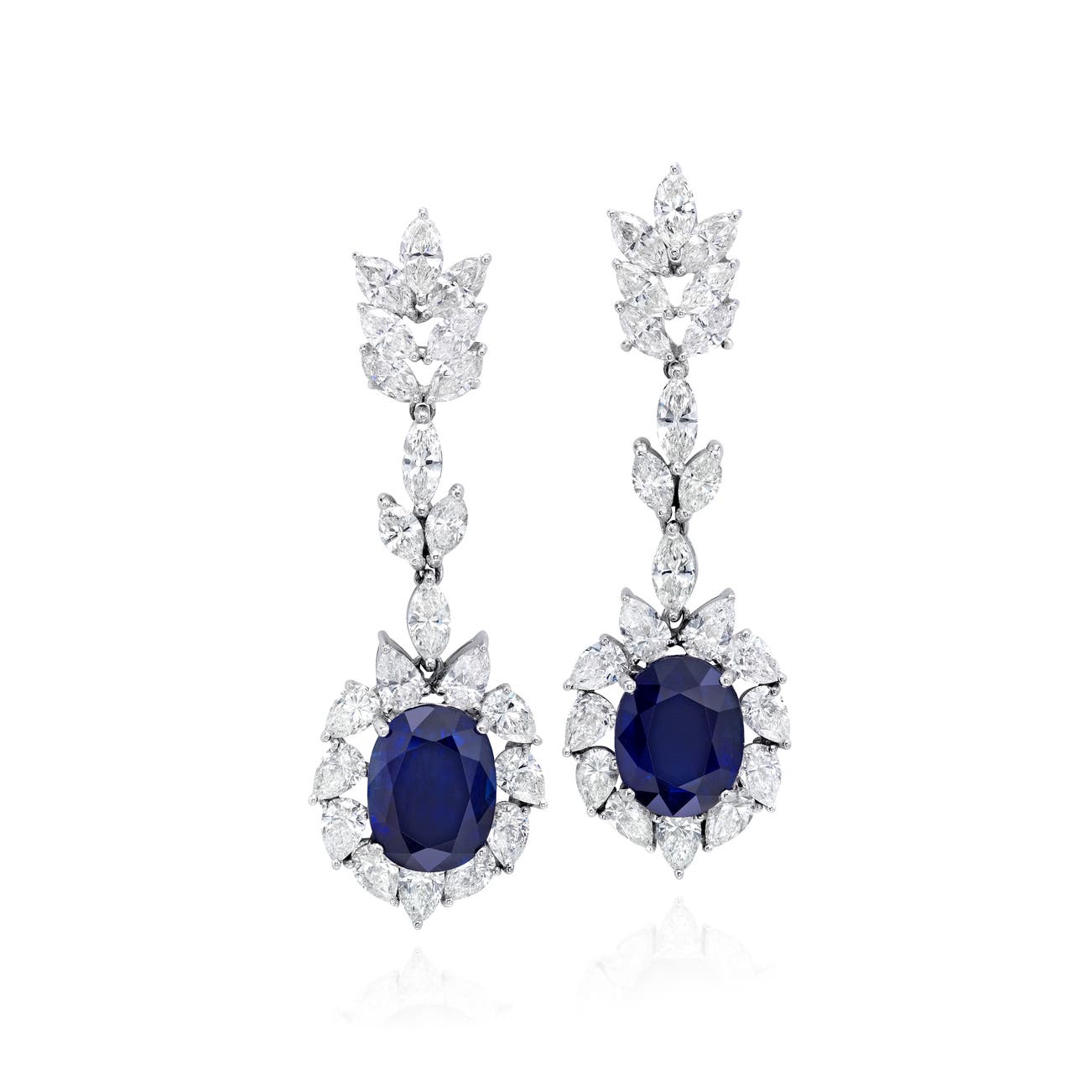 Each set with an oval sapphire weighing approximately 6.10 and 6.60 carats respectively, accented by marquise- and pear-shaped diamonds, mounted in platinum, measuring approximately 2 inches.