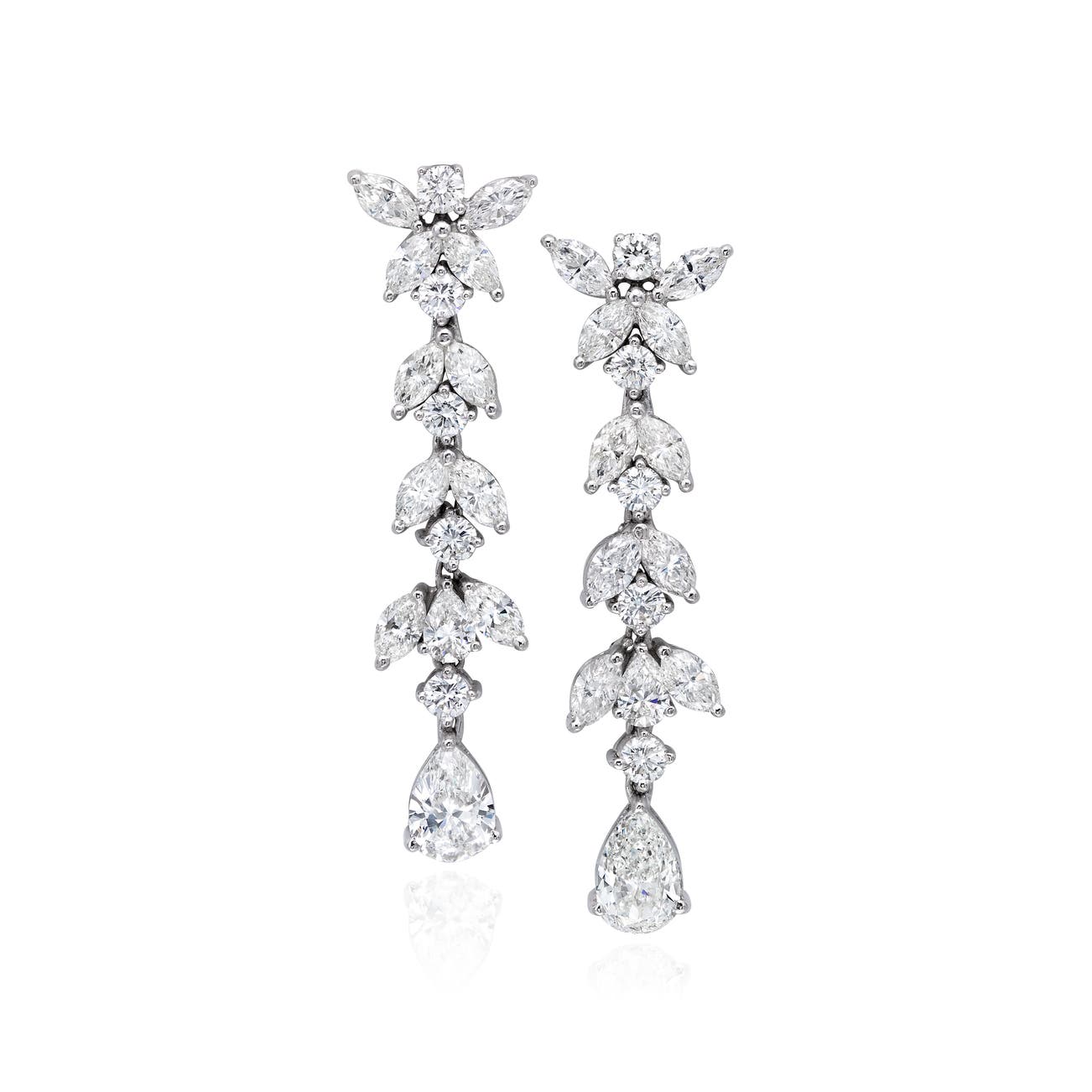 Each surmount set with marquise-shaped and brilliant-cut diamonds, suspending a pear-shaped diamond, mounted in platinum, length measuring approximately 2 inches.